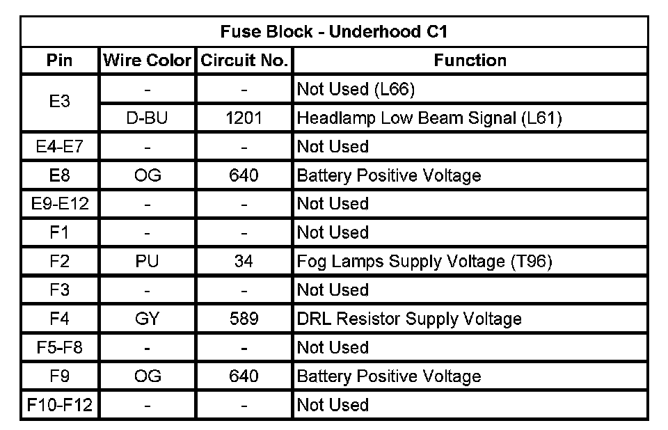 Fuse Block - Underhood C1 (Pin E3 To F12):