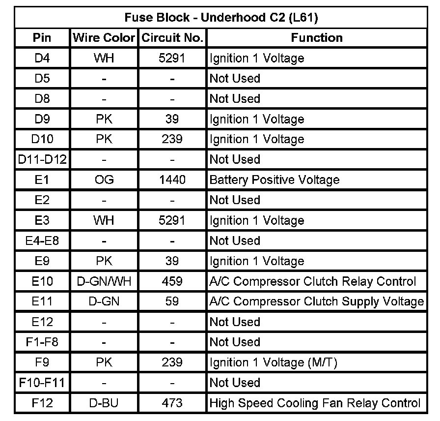 Fuse Block - Underhood C2 (L61) (Pin D4 To F12):