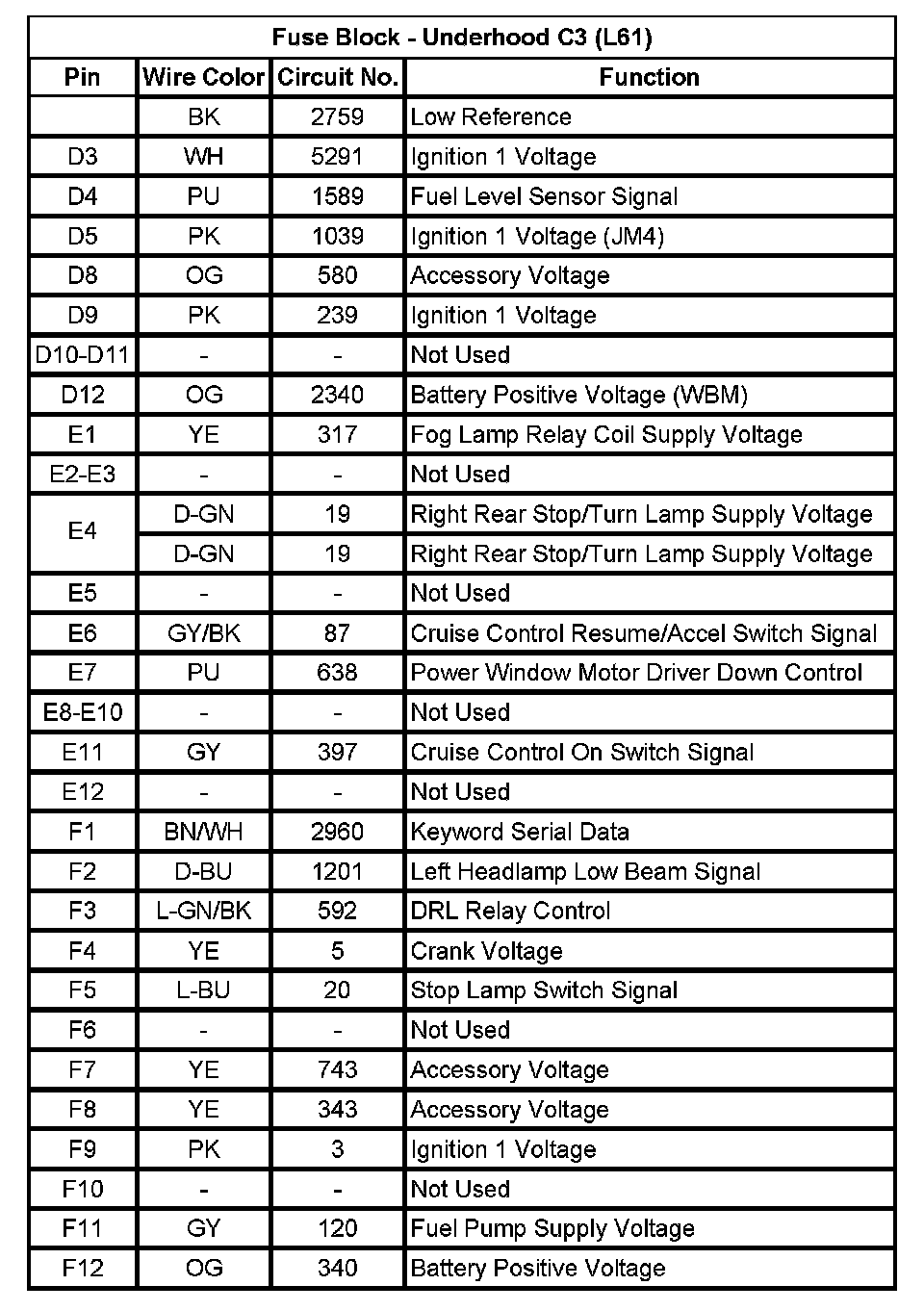 Fuse Block - Underhood C3 (L61) (Pin D3 To F12):