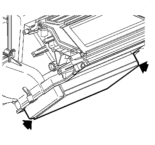 15. Grasp the heater core at end tanks and remove heater core. Spray the perimeter of the heater core seal and the heater core pipes at the front of dash with a soap and water mixture to ease removal.