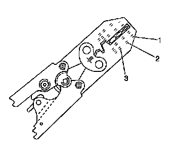 6. Place the DuraSeal splice sleeve in the nest. Ensure that the crimp falls midway between the end of the barrel and the stop. The sleeve has a stop (3) in the middle of the barrel (2) in order to prevent the wire (1) from going further. Close the hand crimper handles slightly in order to firmly hold the DuraSeal splice sleeve in the proper nest.
