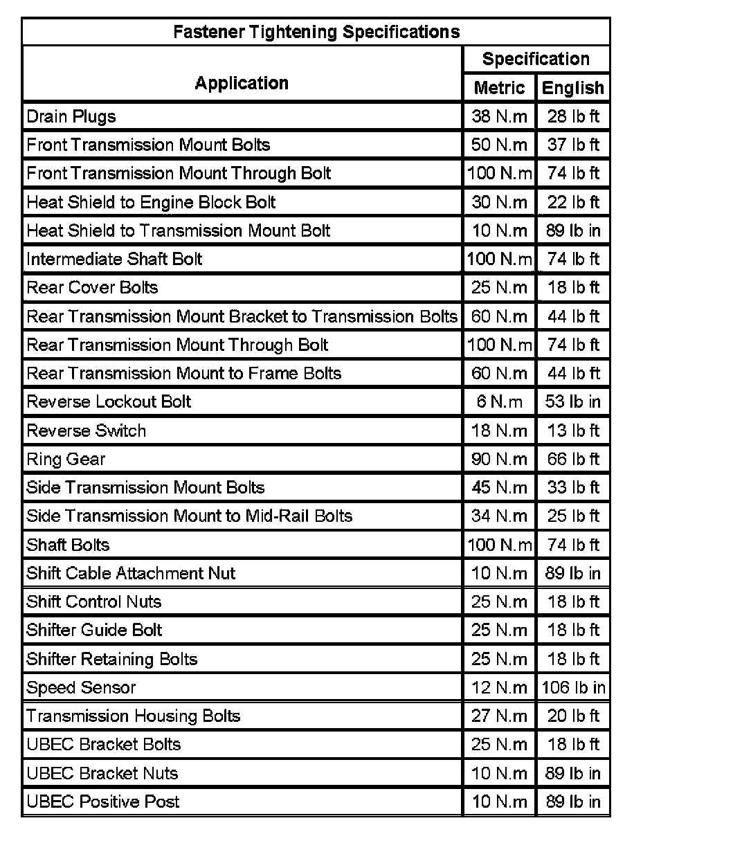 Fastener Tightening Specifications: