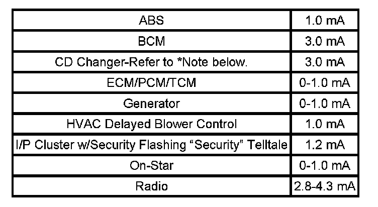 Important: During CD changer initialization, parasitic current draw will fluctuate between 3 mA to 1 A. The initialization period lasts up to a maximum of 90 seconds. After initialization, the CD changer parasitic current draw will stabilize at approximately 3 mA.