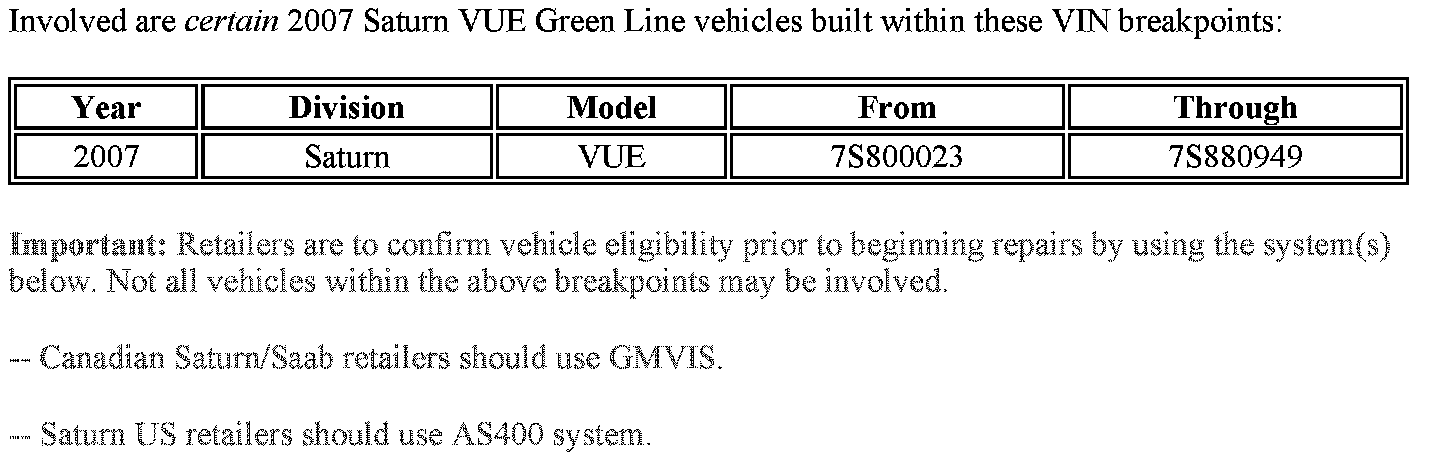 - US Saturn retailers - Facility VIN List (included with bulletin in GM DealerWorld)