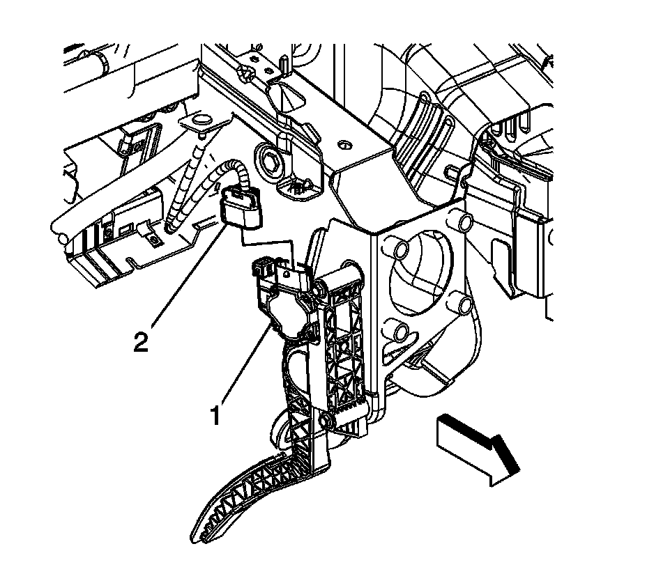 2. Disconnect the instrument panel wiring harness electrical connector (2) from the accelerator pedal position (APP) sensor (1).