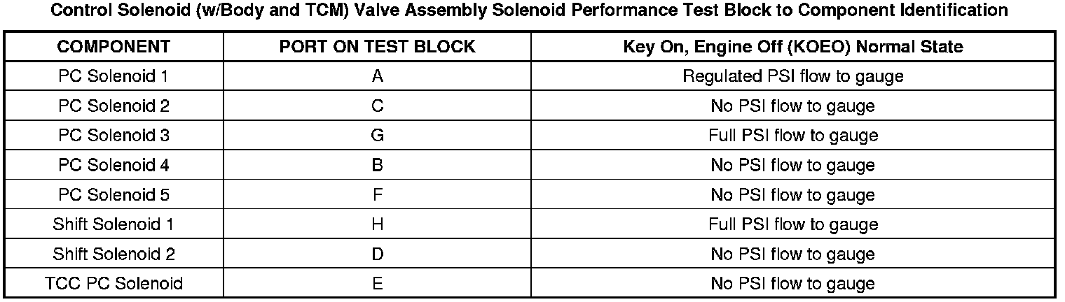 The purpose of this procedure is to test the functionality of the control solenoid (w/body and TCM) valve assembly solenoids for a gross stuck open or stuck closed condition. TheDT-47825-100 test block is bolted to the control solenoid (w/body and TCM) valve assembly on the valve body mounting surface. Pressurized air is passed into the aluminum test block, through the control solenoid (w/body and TCM) valve assembly solenoid passage and back to a pressure gage on the test block. The pressure gage indicates open if air pressure is passed through the solenoid, or closed if the solenoid is unable to pass air through. A scan tool is used to command the solenoids ON and OFF. While watching the pressure gage, one can determine the valve functionality. The recommended shop air pressure for this test is 90-100 psi.