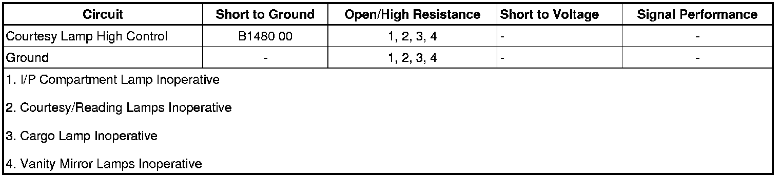 Battery voltage is applied at all times to the body control module (BCM) from the INT LAMPS Fuse located in the rear fuse block. The BCM then applies this voltage to the following lamps: