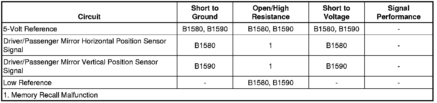 The Driver Door Switch (DDS) and Passenger Door Switch (PDS) determine the position of the outside rearview mirrors based on inputs from two mirror position sensors, one for vertical position, the other for horizontal position. 5 volts is applied to each sensor through a shared 5-volt reference circuit and a shared low reference circuit supplies ground. Each sensor has an individual signal circuit which provides position voltage to the DDS/PDS.