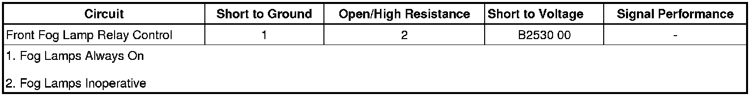 Voltage is applied at all times to the fog lamp relay. When the fog lamp switch is placed in the ON position, a ground signal is applied to the body control module (BCM) through the fog lamp switch signal circuit. The BCM then applies a ground to the fog lamp relay control circuit. This engages the fog lamp relay and applies voltage through the FOG LAMP fuse to the front fog lamps.