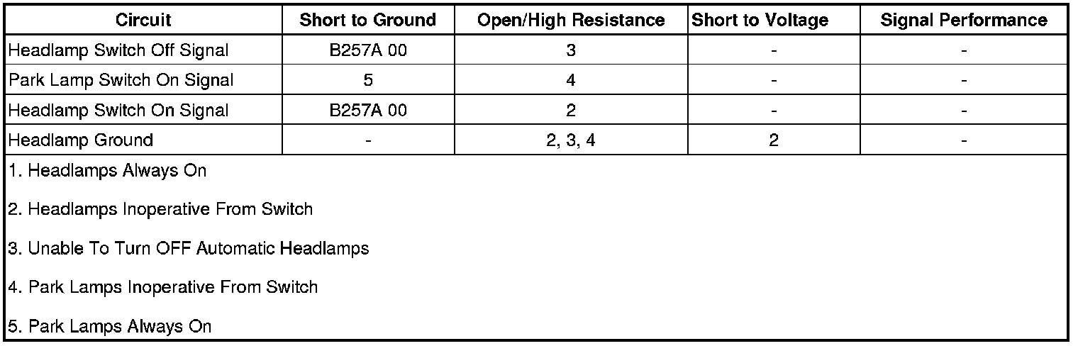 When the headlamp switch is in the OFF position, the body control module (BCM) receives a ground signal through the headlamp switch OFF circuit and an open signal on the park lamp ON circuit and headlamps ON circuit. When the headlamp switch is in the PARK or HEAD position, the BCM receives an open signal through the headlamp switch OFF circuit and a ground signal through the park lamp ON circuit or headlamp ON circuit.