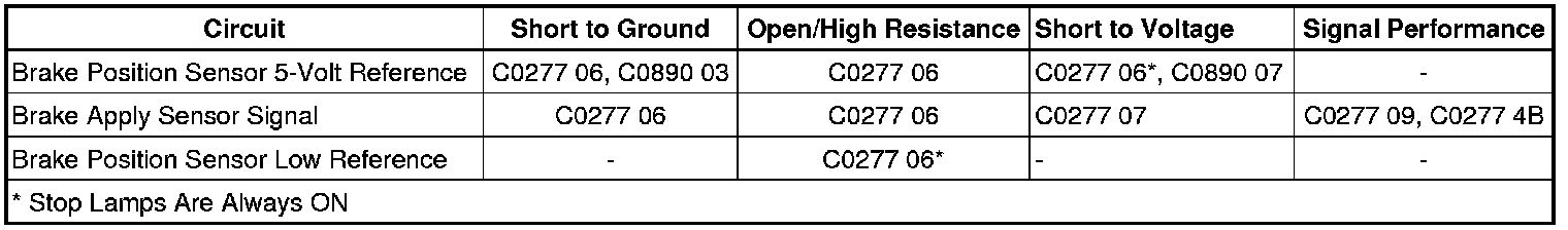 The BCM detects a short to ground or open on the brake apply sensor signal circuit, or a short to ground or an open in the brake position sensor 5-volt reference circuit.
