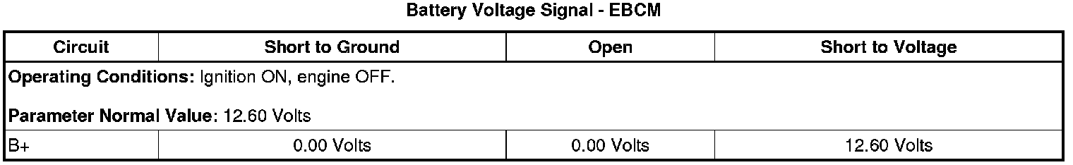 2. Observe the scan tool EBCM Battery Voltage Signal parameter. The reading should be between 12.6 and 15.0 volts.