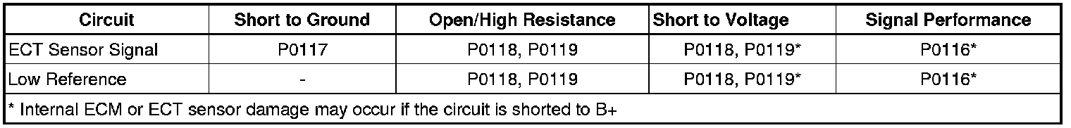 * A short to ground or voltage through a conductive material or fluid could set this DTC. Inspect the ECT sensor for evidence of engine coolant leaking into the connector body.