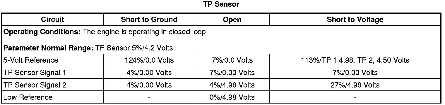 The throttle body assembly contains 2 throttle position (TP) sensors. The TP sensors are mounted to the throttle body assembly and are not serviceable. The TP sensors provide a signal voltage that changes relative to throttle blade angle. The engine control module (ECM) supplies the TP sensors with a common 5-volt reference circuit , a common low reference circuit, and two independent signal circuits. The TP sensors have opposite functionality. TP sensor 1 signal voltage decreases from greater than 4 volts at idle to less than 1 volt at wide open throttle (WOT). TP sensor 2 signal voltage increases from less than 1 volt at idle to greater than 4 volts at WOT.