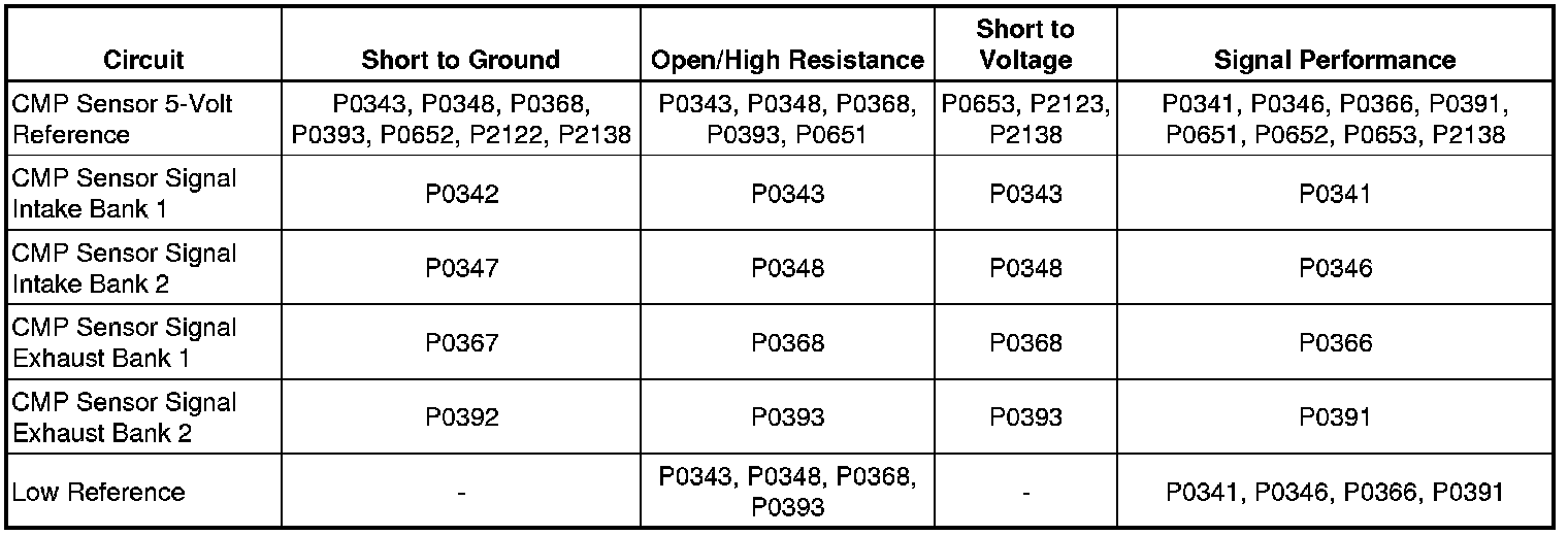 Each camshaft is equipped with a camshaft position (CMP) sensor that the engine control module (ECM) monitors. The CMP sensor is a hall effect switch that works in conjunction with a 4X reluctor wheel. The reluctor wheels are mounted to the camshaft position actuators that are mounted to the end of the camshafts. The ECM uses the CMP sensor signals in order to determine the position of the camshafts. The ECM supplies 5 volts to the CMP sensors on the 5-volt reference circuits, and supplies a ground on the low reference circuits. The CMP sensors provide a signal to the ECM on the signal circuits. If the ECM detects extra or missing CMP sensor signal transitions, or a signal voltage that is more or less than the predetermined range, within a certain number of crankshaft revolutions, one of these DTCs sets.