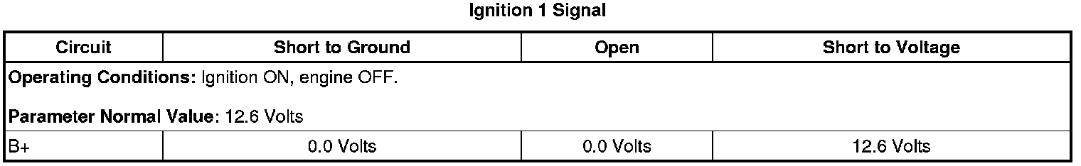 2. Observe the scan tool Ignition 1 Signal parameter. The reading should be between 12.6 and 15.0 V.