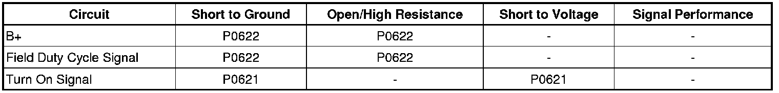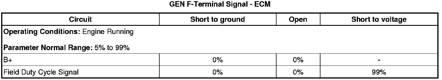 The engine control module (ECM) uses the generator field duty cycle signal circuit, or F-terminal circuit, to monitor the duty cycle of the generator. The generator field duty cycle signal circuit connects to high side of the field windings in the generator. A pulse width modulated (PWM) high side driver in the voltage regulator turns the field windings ON and OFF. The ECM uses the PWM signal input to determine the generator load on the engine. This allows the ECM to adjust the idle speed to compensate for high electrical loads. The ECM monitors the status of the generator field duty cycle signal circuit. When the ignition is ON and the engine is OFF, the ECM should detect a duty cycle near 0 percent. When the engine is running, the duty cycle should be between 5-99 percent.