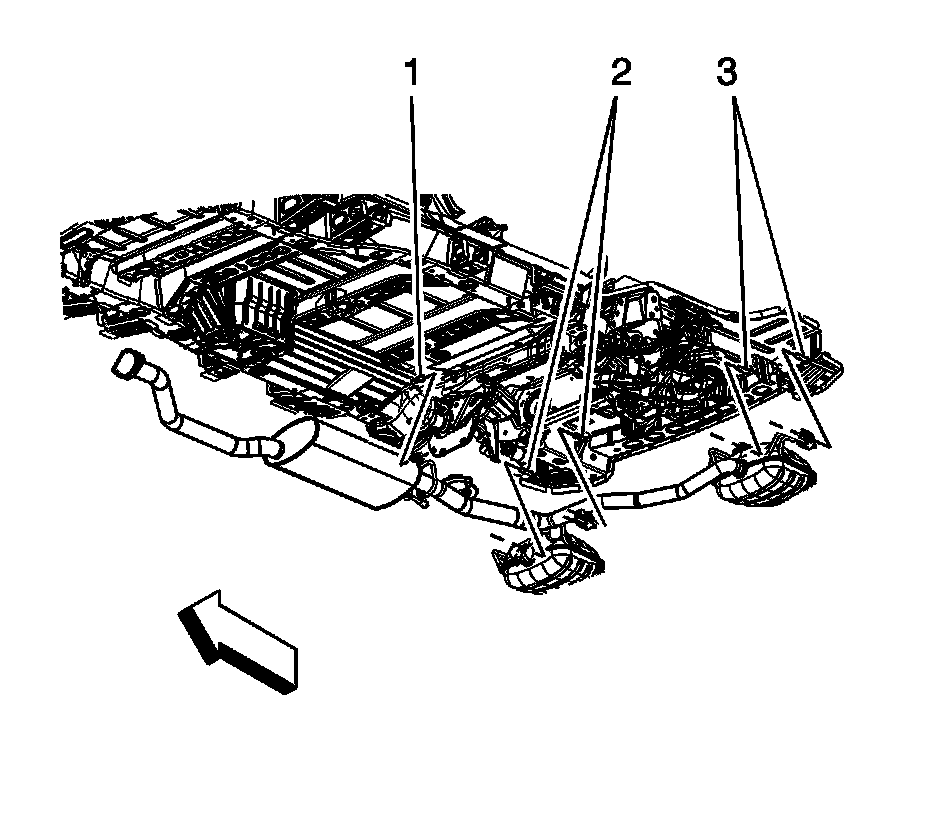 4.If necessary, lower the exhaust system by separating the rubber insulators from the exhaust underbody hangers (1. 2, and 3).