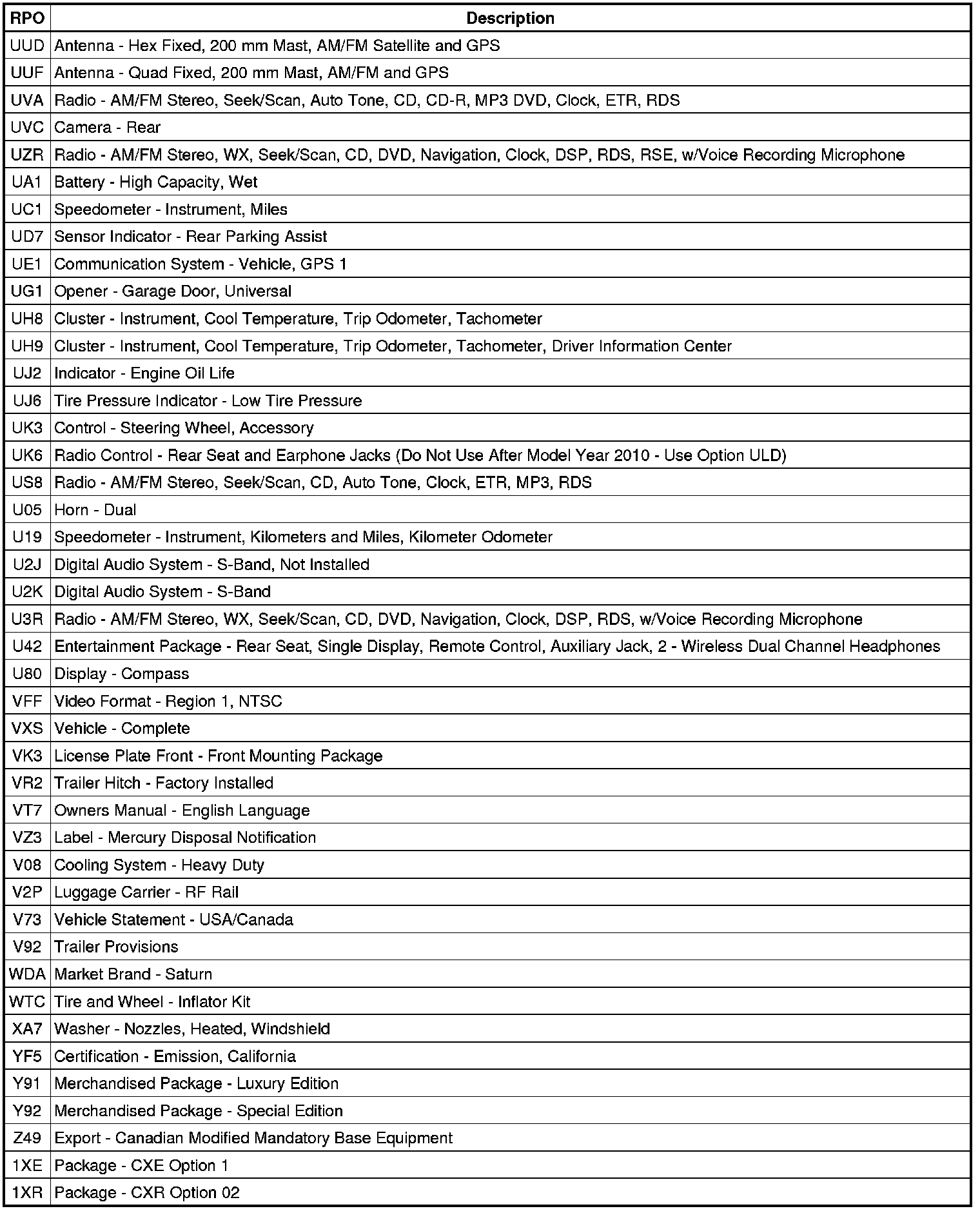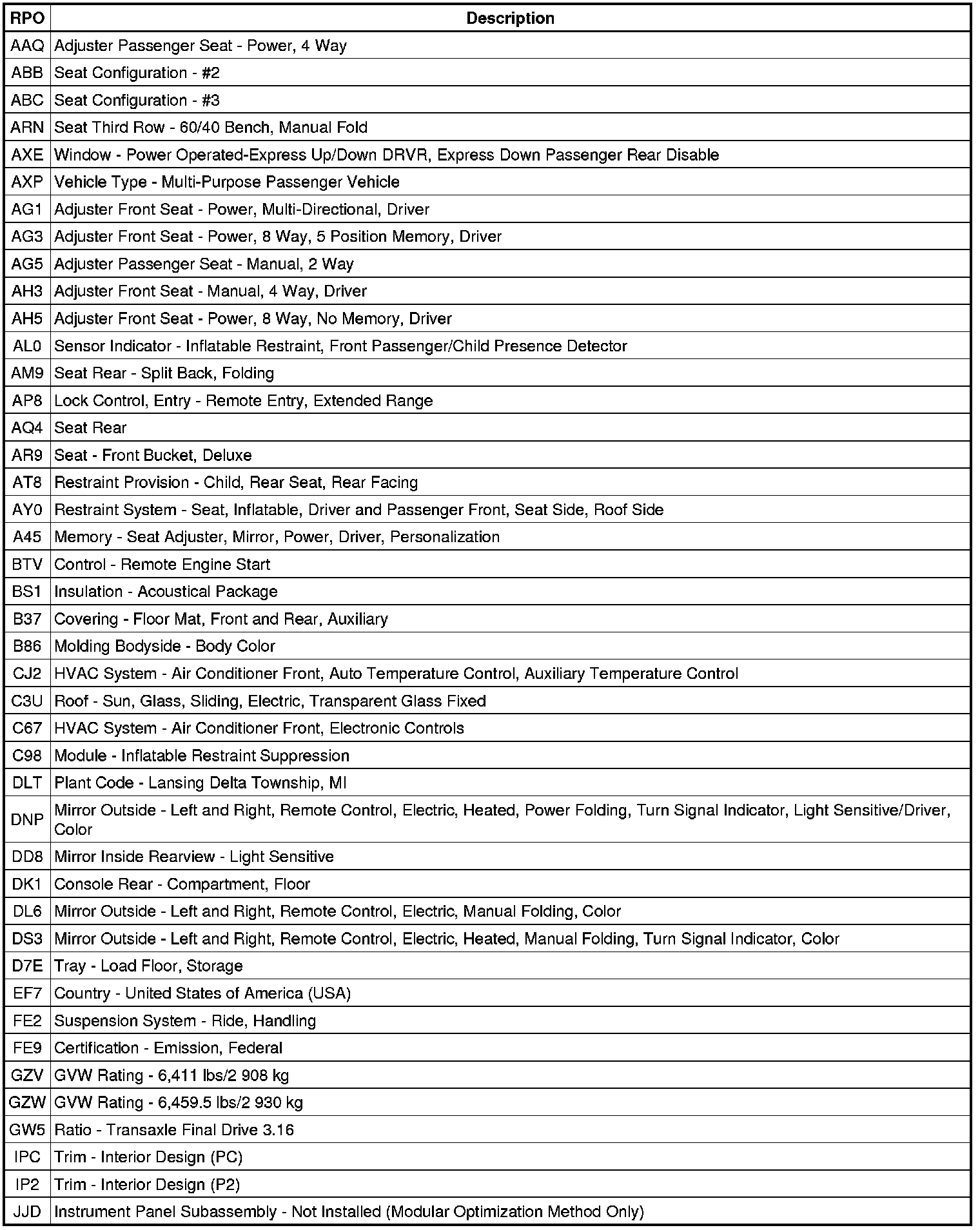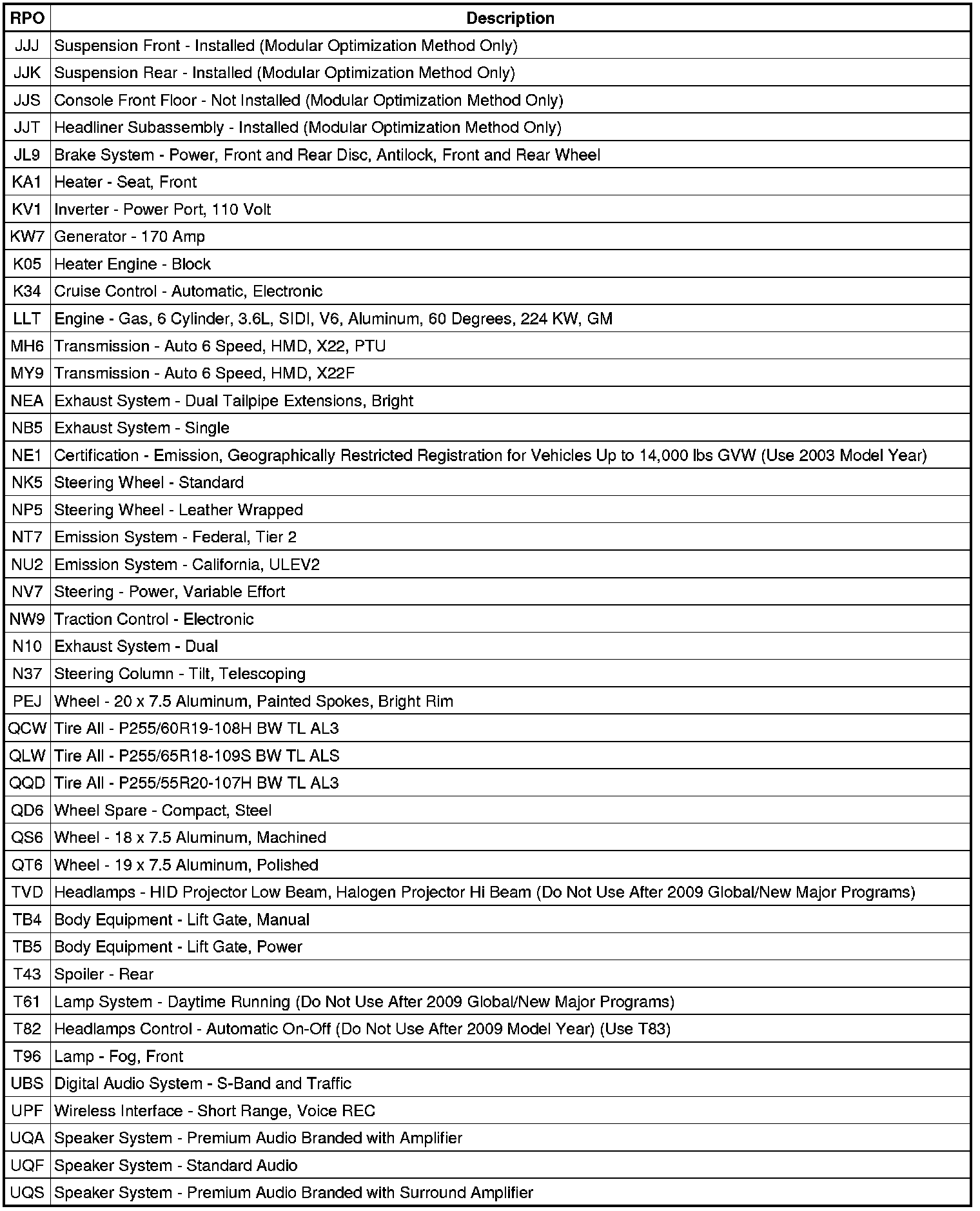 The following table provides the description of the RPO codes that are available on the vehicle. The vehicles RPO list is printed on the Service Parts Identification Label.