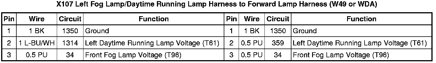 X107 Left Fog Lamp/Daytime Running Lamp Harness to Forward Lamp Harness (W49 or WDA)