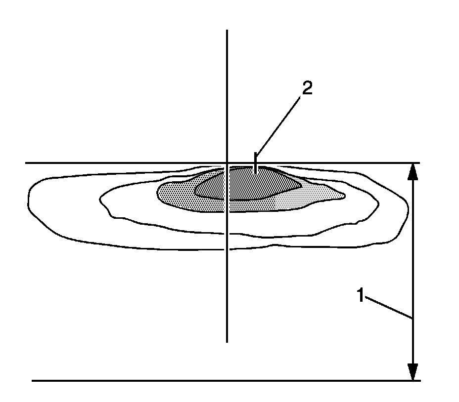 5. Adjust the vertical headlamp adjustment screw until the Hot Spot (Center of mass of the Bright Area) is set at 8.0 inches (2) below the headlamp horizontal access (1) within +/- 2 inches when measured at 25 feet.