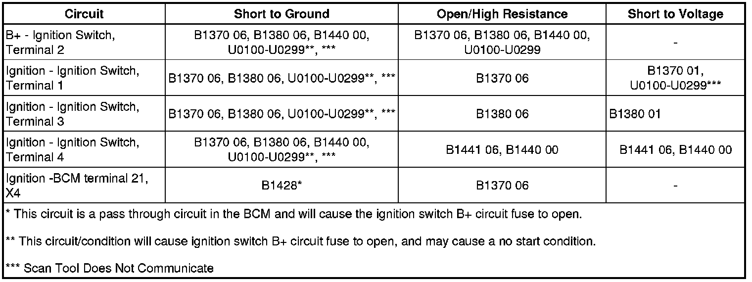 * BCM senses an open on the B+ circuit (to the ignition switch) while engine is running. An open on the B+ circuit can be caused by a short to ground on any of the following circuits: