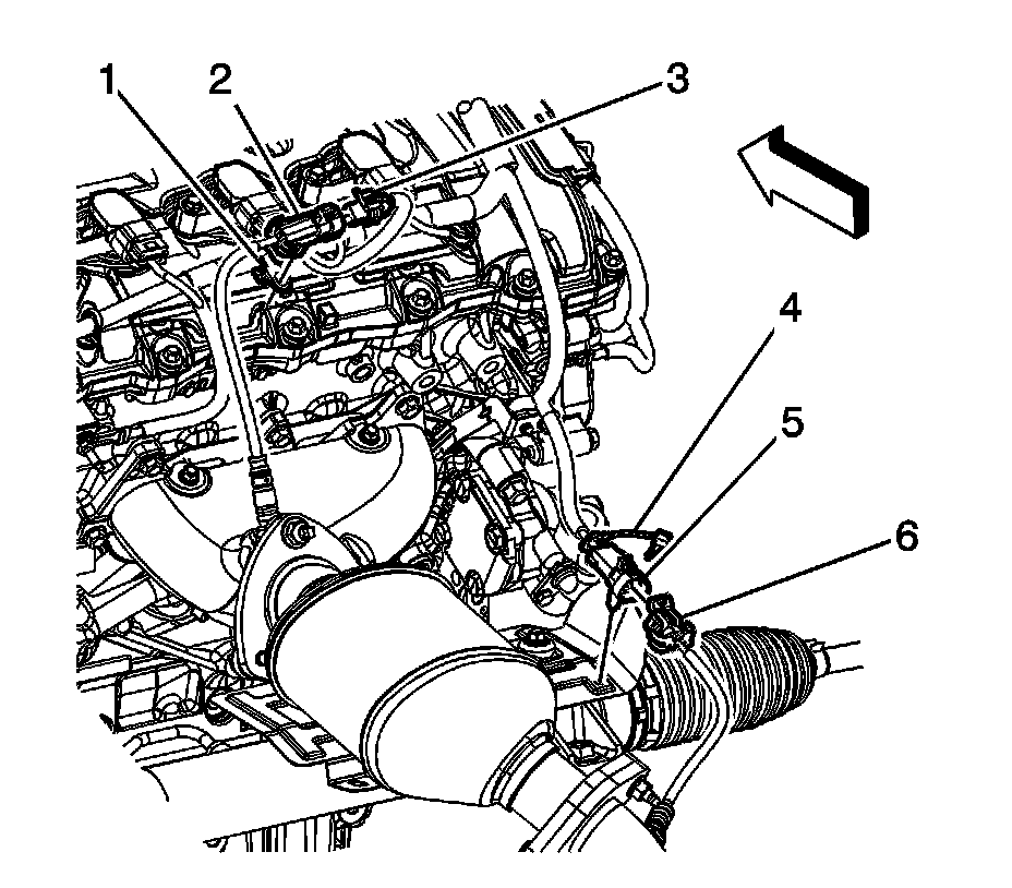 3. Disconnect the heated oxygen sensor (HO2S) electrical connector (6) from the engine wiring harness electrical connector (5).