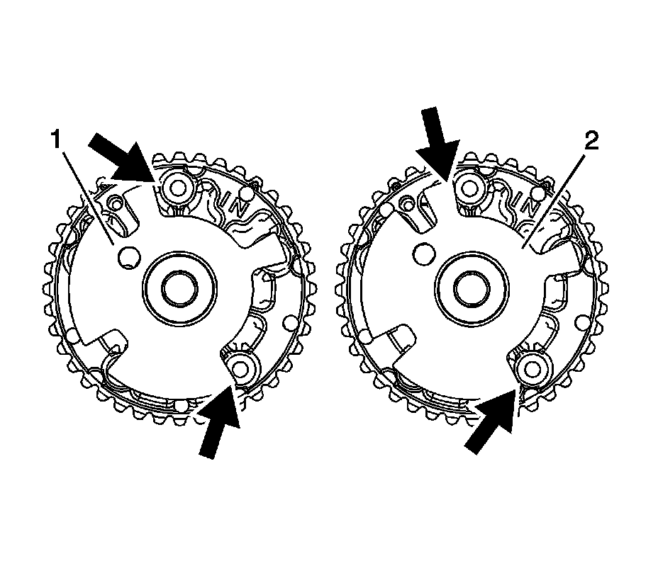 2. Ensure the proper camshaft position actuator is being installed. The reluctor wheel on the right intake camshaft position actuator (1) is indexed in a different position compared to the left intake camshaft position actuator (2).