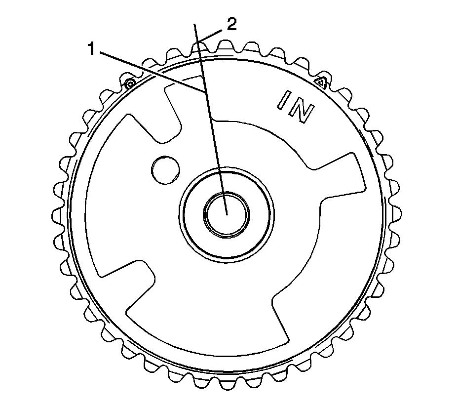 3. On the left intake camshaft actuator the edge of the reluctor wheel (1) lines up with the peak (2) of the sprocket tooth.