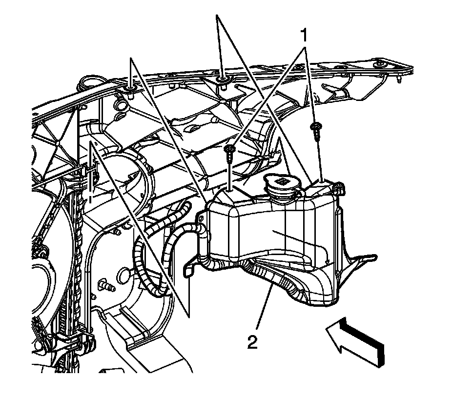 7. Remove the reservoir (2) tabs from the upper radiator support, position the reservoir out of the way.