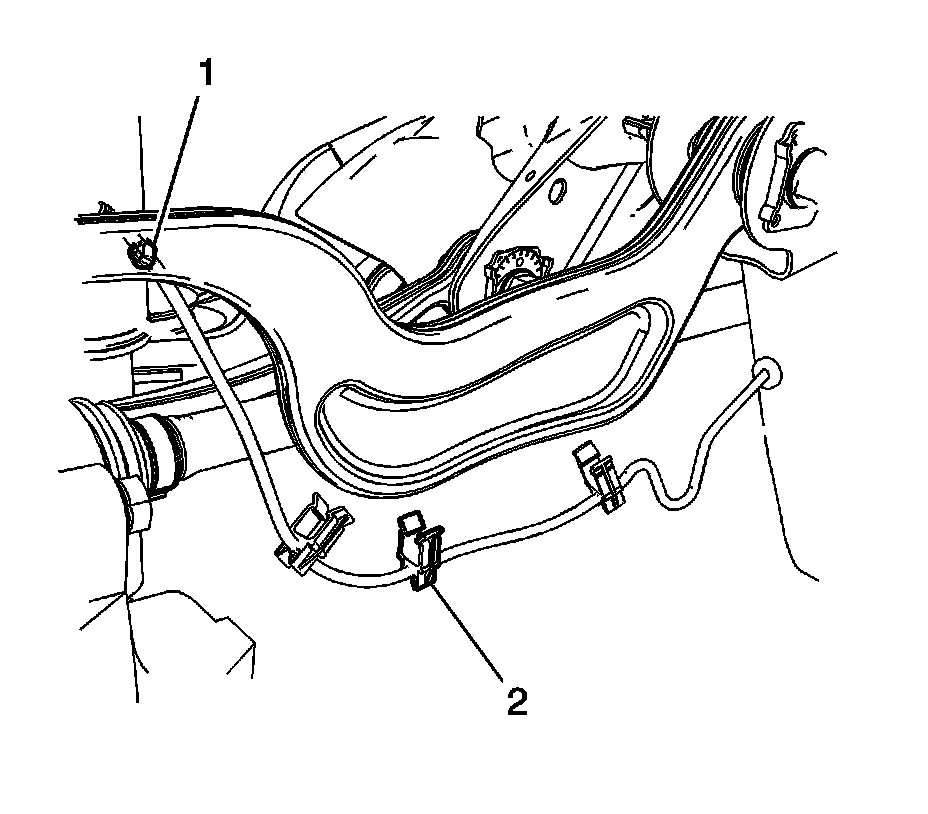 3. Remove the speed sensor wiring harness retaining clips (1) and (2) from the upper control arm.
