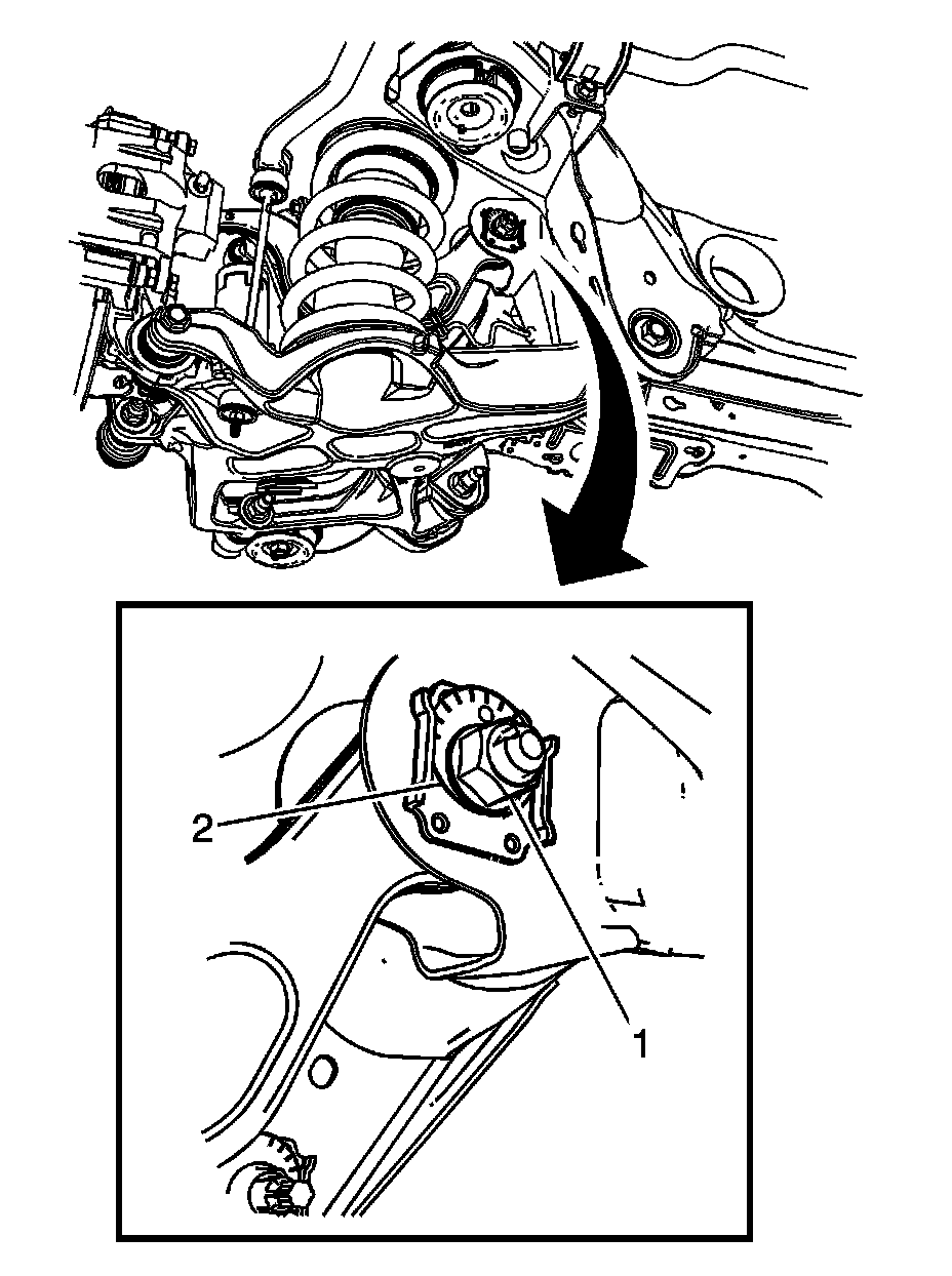 8. Install the upper control arm bolt (2) and nut (1).