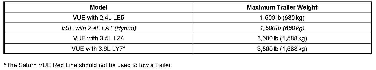 The chart above shows how much the trailer can weigh, based on the vehicle powertrain combination. Retailers should refer customers to the appropriate model year Saturn VUE Owner Manual for important trailering tips, vehicle maintenance, and safety rules before towing a trailer.