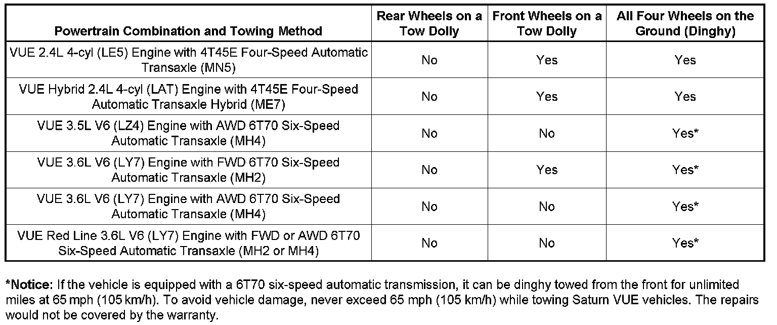 Recreational vehicle towing means towing the vehicle behind another vehicle such as behind a motorhome. The two most common types of recreational vehicle towing are known as "dinghy towing" (towing the vehicle with all four wheels on the ground) and "dolly towing" (towing the vehicle with two wheels on the ground and two wheels up on a device known as a "dolly"). With the proper preparation and equipment, many vehicles can be towed in these ways. Refer to the appropriate model year Saturn VUE Owner Manual for towing preparation guidelines and dolly and dinghy towing procedures. The Towing Chart below summarizes powertrain combination compatibility with dolly and dinghy towing methods.