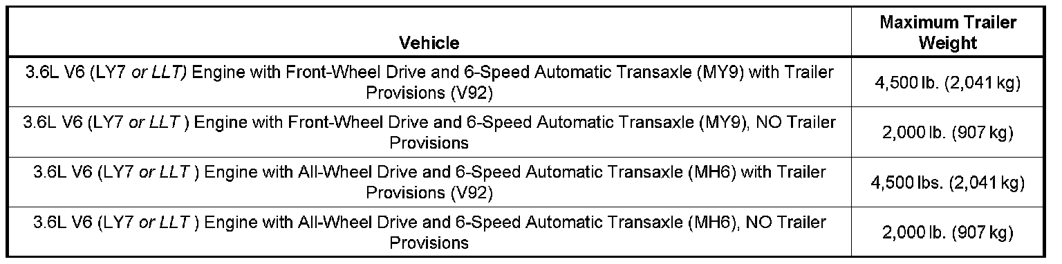 The chart above shows how much the trailer can weigh, based on the vehicle powertrain combination. Retailers should refer customers to the appropriate model year Saturn OUTLOOK Owner Manual for important trailering tips, vehicle maintenance, and safety rules before towing a trailer.