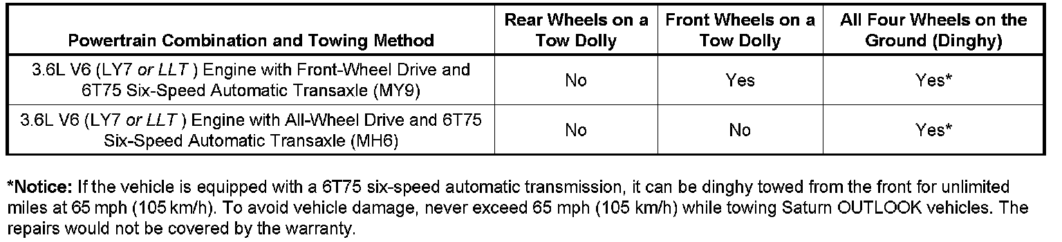 Recreational vehicle towing means towing the vehicle behind another vehicle such as behind a motorhome. The two most common types of recreational vehicle towing are known as "dinghy towing" (towing the vehicle with all four wheels on the ground) and "dolly towing" (towing the vehicle with two wheels on the ground and two wheels up on a device known as a "dolly"). With the proper preparation and equipment, many vehicles can be towed in these ways. Refer to the appropriate model year Saturn OUTLOOK Owner Manual for towing preparation guidelines and dolly and dinghy towing procedures. The Towing Chart above summarizes powertrain combination compatibility with dolly and dinghy towing methods.