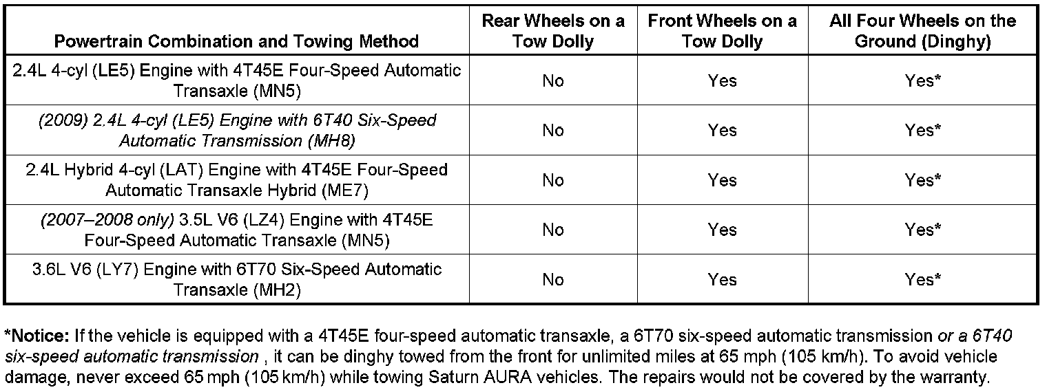Recreational vehicle towing means towing the vehicle behind another vehicle such as behind a motorhome. The two most common types of recreational vehicle towing are known as "dinghy towing" (towing the vehicle with all four wheels on the ground) and "dolly towing" (towing the vehicle with two wheels on the ground and two wheels up on a device known as a "dolly"). With the proper preparation and equipment, many vehicles can be towed in these ways. Refer to the appropriate model year Saturn AURA Owner Manual for towing preparation guidelines and dolly and dinghy towing procedures. The Towing Chart above summarizes powertrain combination compatibility with dolly and dinghy towing methods.