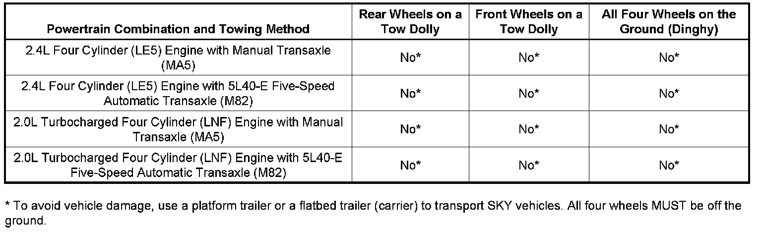 Recreational vehicle towing means towing the vehicle behind another vehicle such as behind a motorhome. The Saturn SKY was not designed to be towed behind another vehicle with any of its wheels on the ground; therefore, dinghy towing is not recommended. If a Saturn SKY needs to be towed, the vehicle should be placed on a platform trailer with all four wheels off the ground. The Towing Chart above summarizes powertrain combination compatibility with different towing methods.