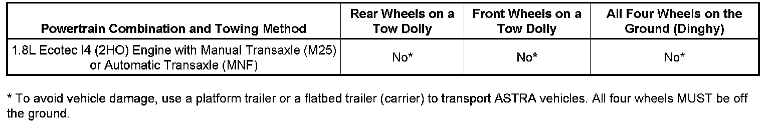 Recreational vehicle towing means towing the vehicle behind another vehicle such as behind a motorhome. The Saturn ASTRA was not designed to be towed behind another vehicle with any of its wheels on the ground; therefore, dinghy towing is not recommended. If a Saturn ASTRA needs to be towed, the vehicle should be placed on a platform trailer with all four wheels off the ground. The Towing Chart above summarizes powertrain combination compatibility with different towing methods. towing methods.