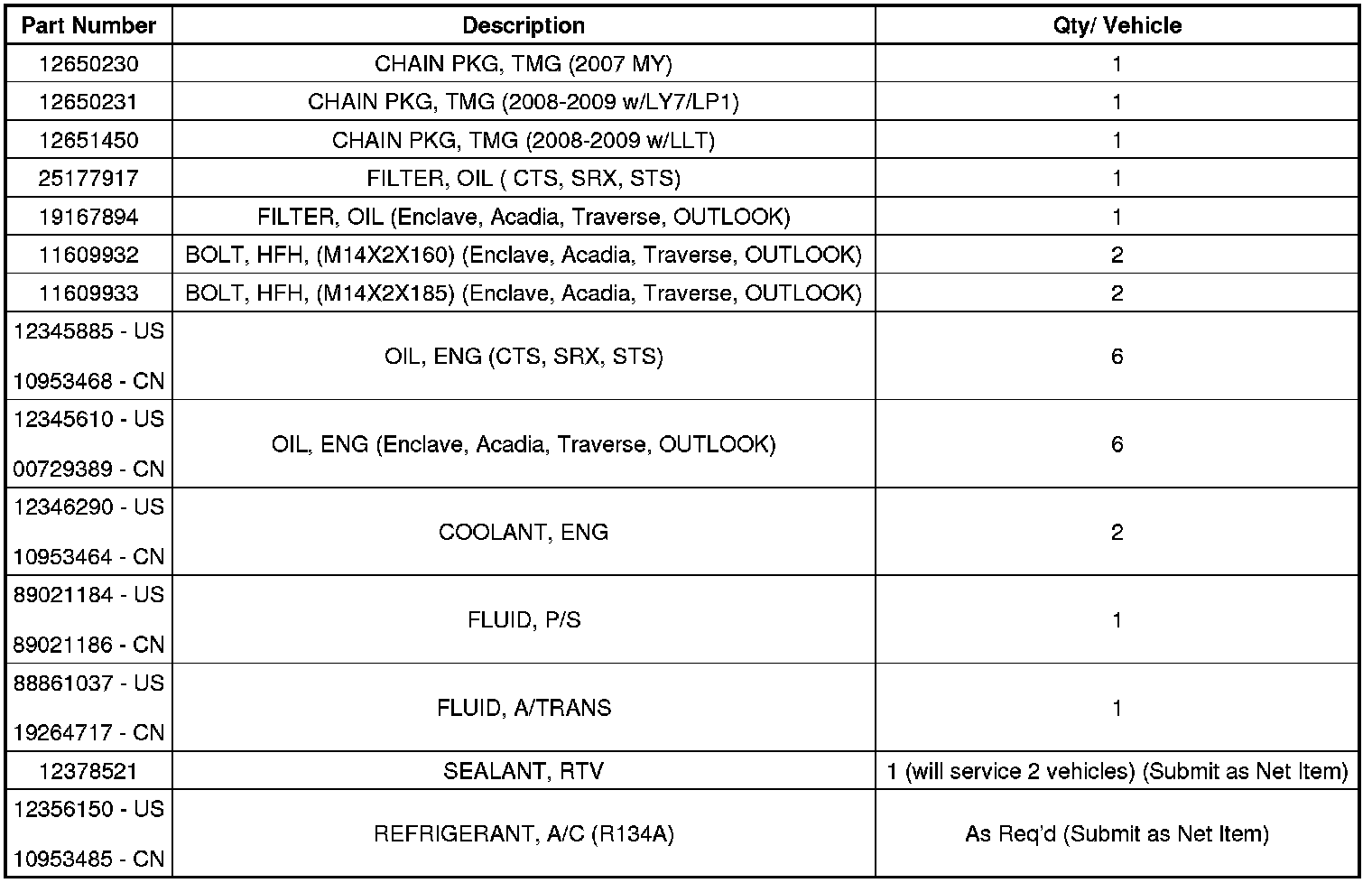 * The amount identified in "Net Item" should represent the actual sum total of the current GMCC&A dealer net price for the RTV sealant and refrigerant needed to perform the required repairs, not to exceed $9.64 USD, $17.20 CAD, plus applicable Mark-Up or Landed Cost (for Export).