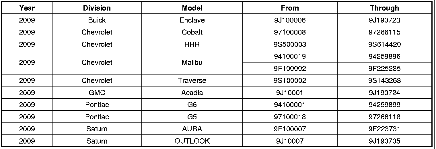 Involved are certain 2009 model year Buick Enclave; Chevrolet Cobalt, HHR, Malibu, Traverse; GMC Acadia; Pontiac G5, G6; and Saturn AURA and OUTLOOK vehicles built within these VIN breakpoints: