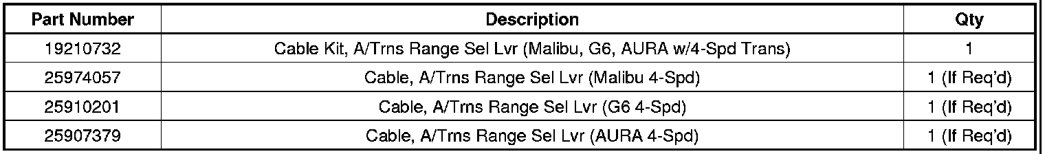 No parts are needed for this recall except as noted below. In the rare event that a shift cable is required for vehicles other than the Malibu, G6 or AURA equipped with a 4-speed transmission, please order the appropriate cable and H-route the claim for wholesale approval.