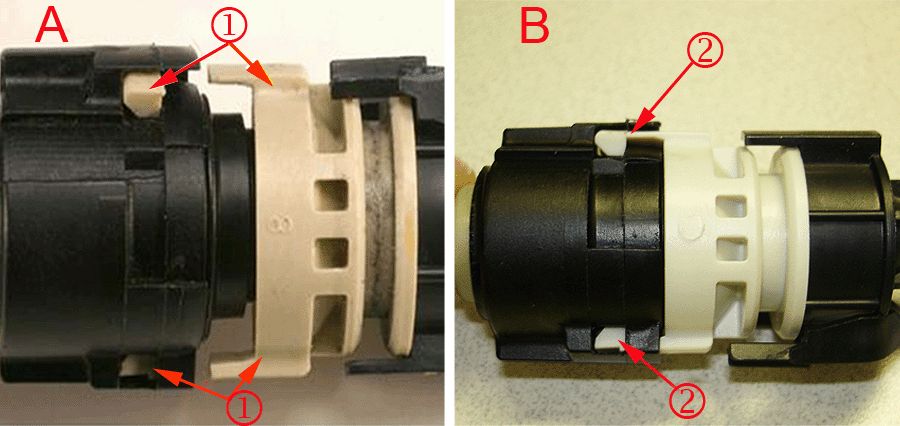 - If the transmission shift cable locking tabs (2) are NOT fractured and separated (B), install the transmission shift cable kit. Proceed to Step 3.