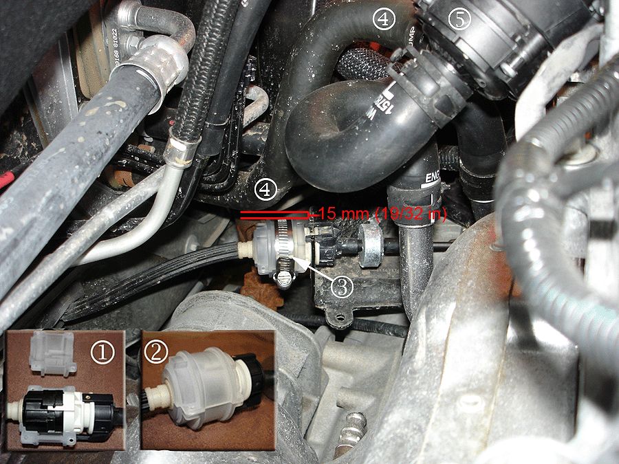 5. Ensure that there is 15 mm (19/32 in) of clearance between the inlet coolant hose (4) and the clam shell (3). On hybrid equipped vehicles, it may be necessary to reposition the inlet coolant hose (4) to achieve the required 15 mm (19/32 in) of clearance. To reposition the inlet coolant hose (4) on hybrid equipped vehicles, locate the heater cooler pump (5) and perform Steps 5.1-5.4.