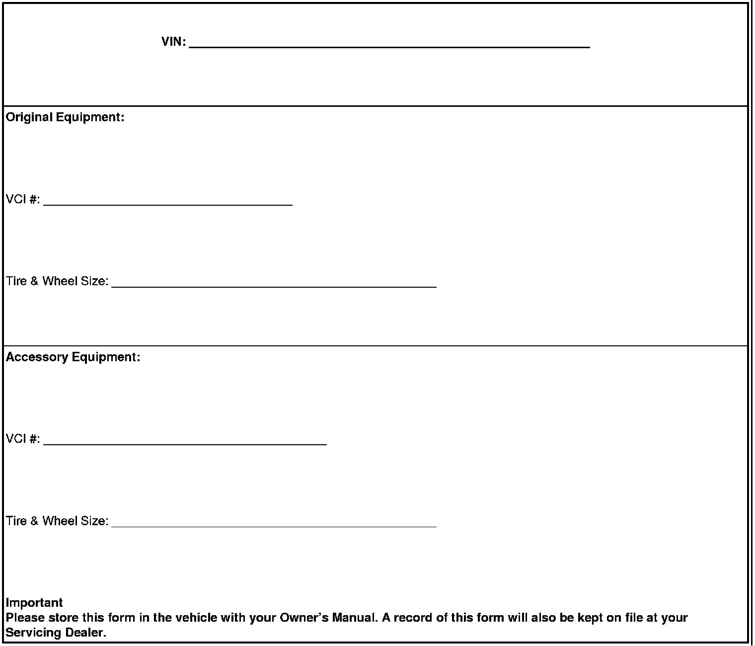 You have just modified your vehicle by installing an "Accessory Package" which includes Wheels and Tires. This form contains important information about your accessory installation. In an effort to provide superior service to you, our customer, we ask that you please present this form to your Servicing Dealer when removing or installing wheels and tires on your vehicle. This form contains important information necessary to service your vehicle.