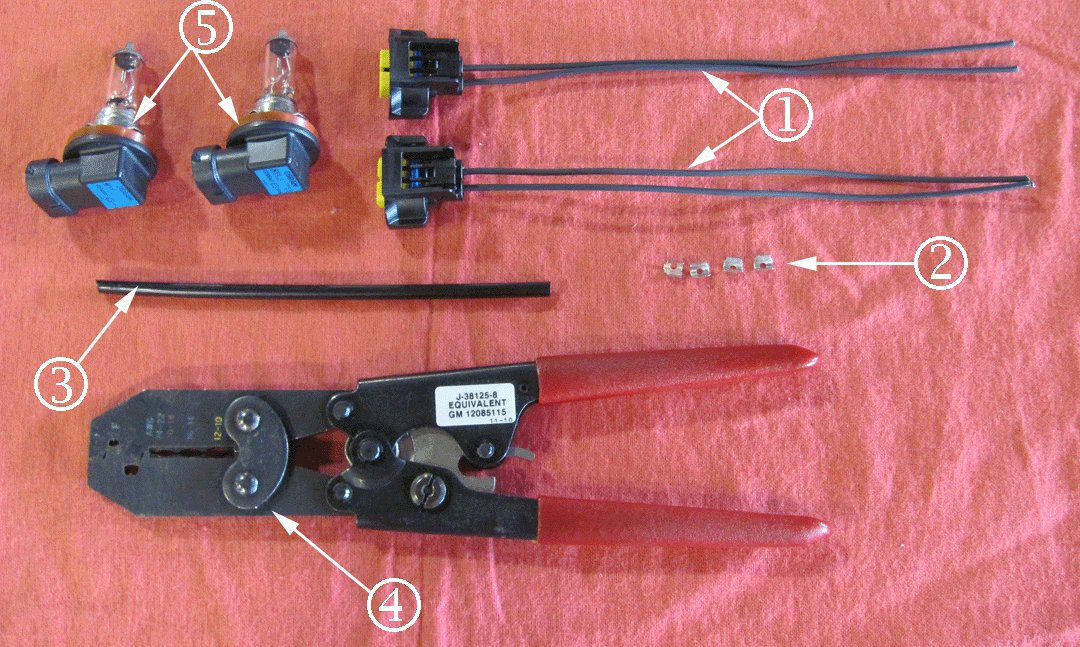The service kit, P/N 22848987, includes two service pigtails (1), four splice clips (2), one piece of heat shrinking tube (3) and two bulbs (5). Use Special Tool J-38125-8 (4) to complete the repair.
