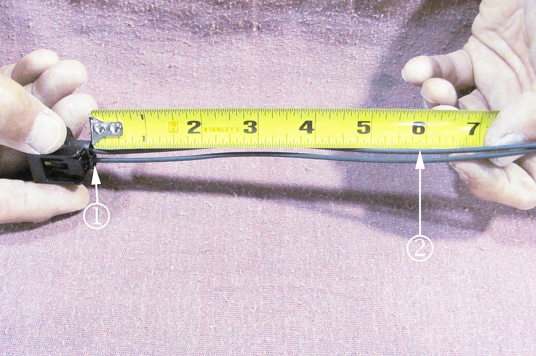 6. Measure the length of the service pigtails. Measure the service pigtails from the back of the connector (1) to the end of the two wires. The length of the service pigtail should be 152 mm (6 in) in length.