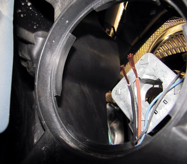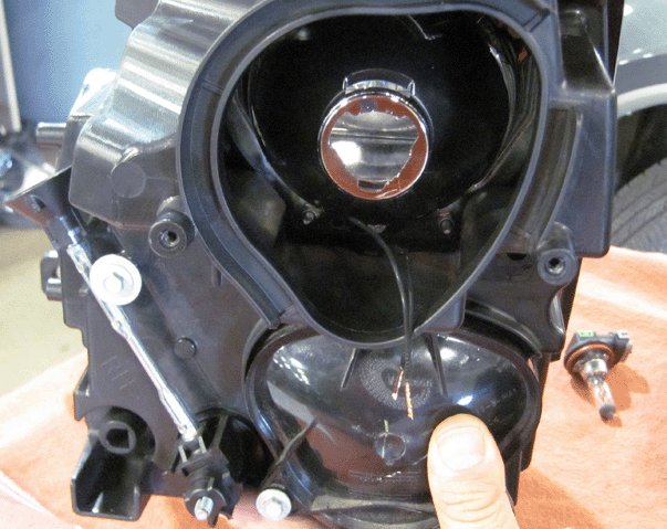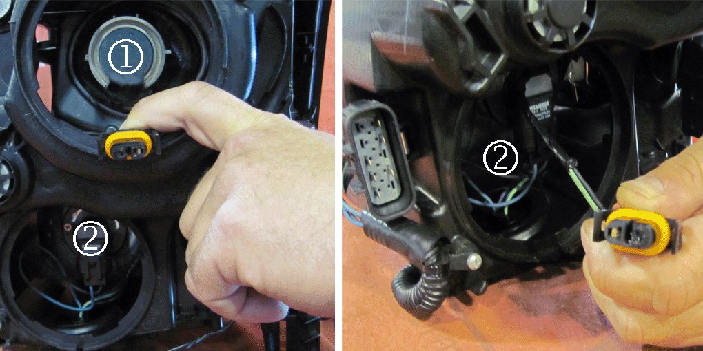 11. Reinstall the wiring harness inside the headlamp housing and attach the connectors to the bulbs.