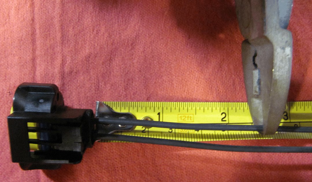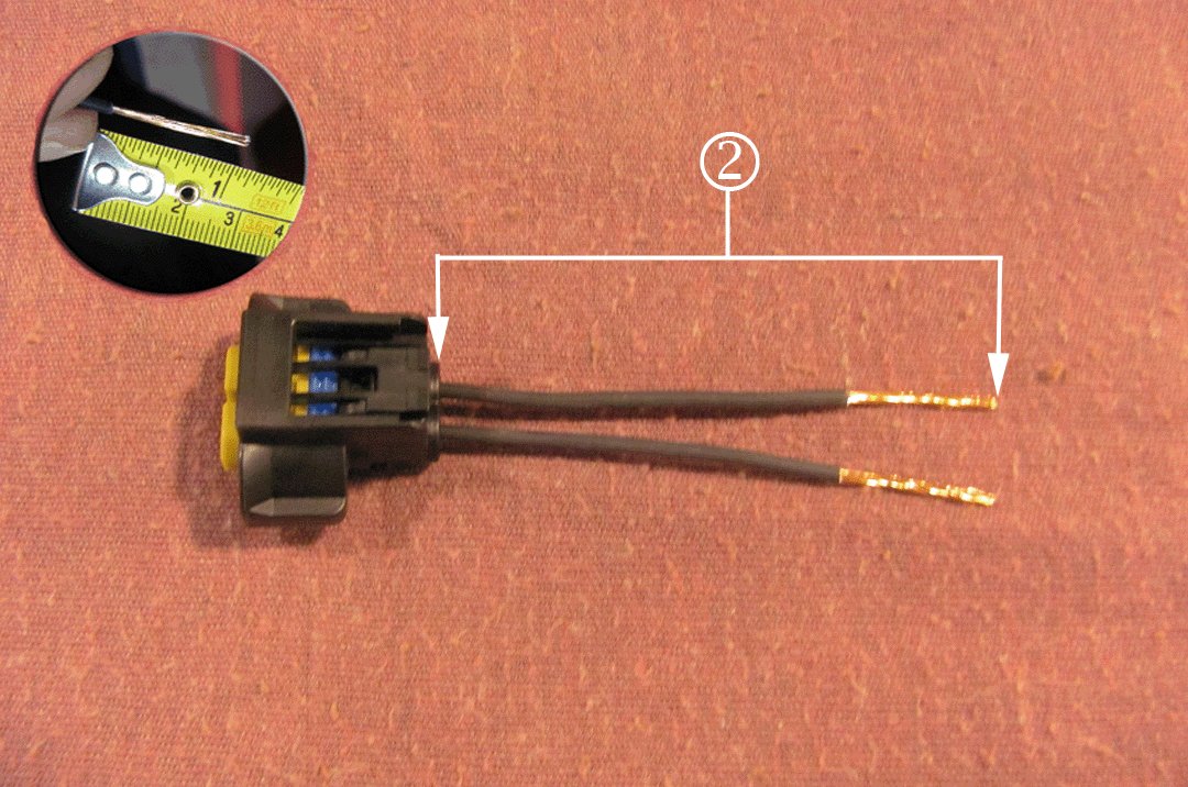 7. Cut the two wires attached to the connector to 76 mm (3 in) in length (2).