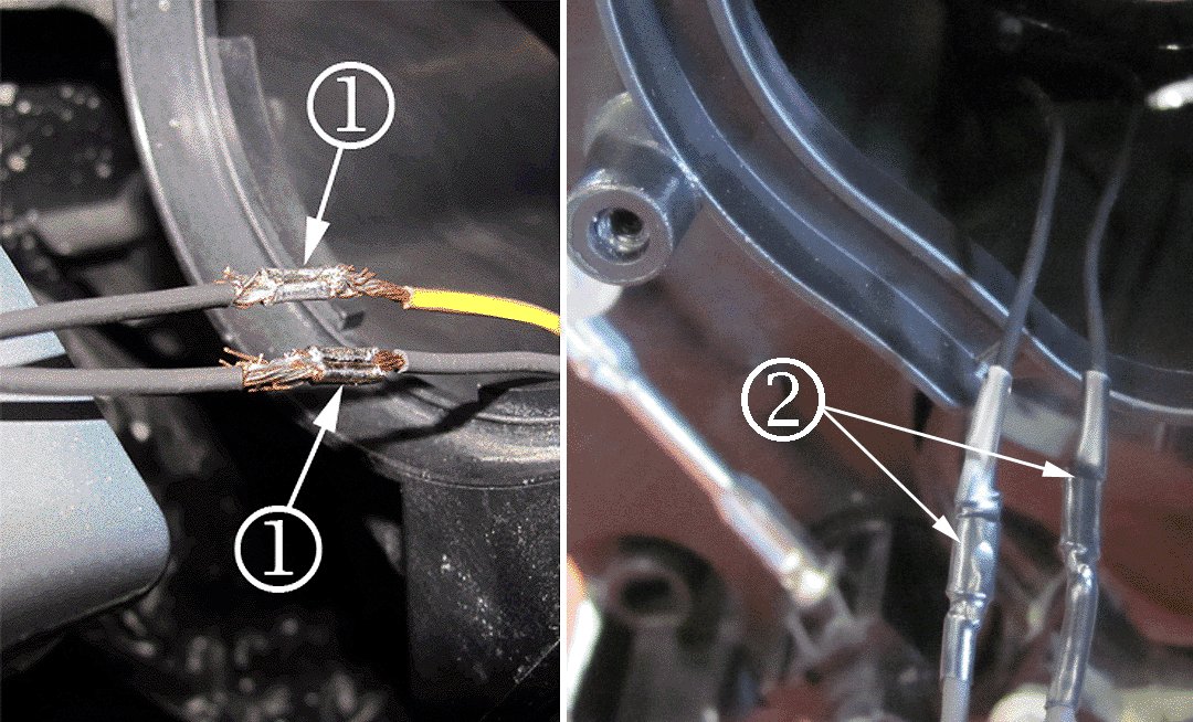 13. Cut the heat shrink tubing into four equal length pieces of 38 mm (1.5 in). Install the 38 mm (1.5) piece of heat shrink tubing over each of the existing headlamp wires prior to crimping. There are two pieces of 38 mm (1.5 in) heat shrink tube needed per head lamp.